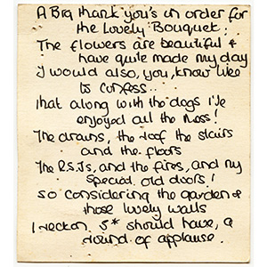 13 Jul 1996 A poem from 'B' to '5*' Builders Jack and Derek thanking them for their flowers after the completion of 'The Stables', Duffield