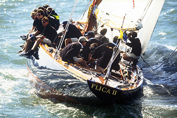 Jul 2001 Robin playing the jib on Flica II at the America's Cup Jubillee at Cowes, Isle of Wight