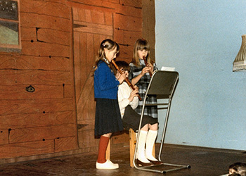 Sarah BECKETT with pigtails standing on left holding the bell cord with Daphne POLLARD. Kate NORGETT (approximately 8-9 yrs) in centre holding bell cord. Ann BECKETT in tartan skirt on right.