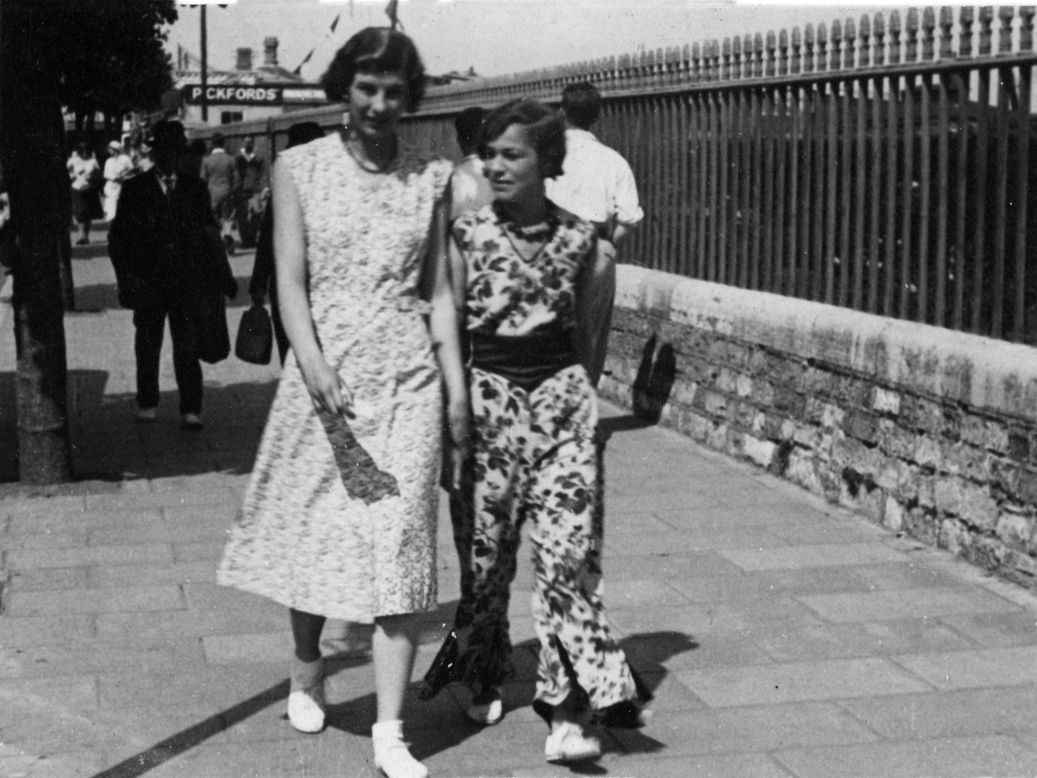 Circa 1933 Dorothy PERKINS walking down a high street with a friend